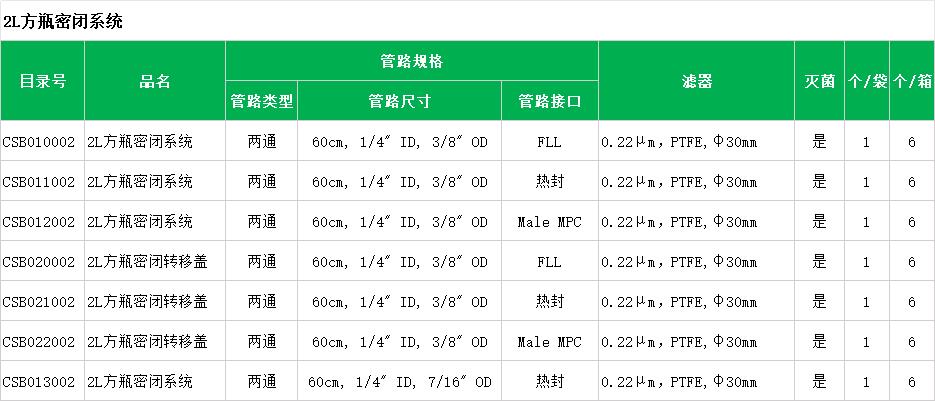 ●材質(zhì):瓶身環(huán)己二醇(共聚聚酯)(PETG),瓶蓋高密度聚乙烯(HDPE),內(nèi)管聚四氟乙烯(PTFE),外管(TPE),F(xiàn)LL接頭聚丙烯(PP)/Male MPC接頭聚碳酸酯(PC),過濾器外殼聚丙烯(PP),過濾器濾膜四氟乙烯(PTFE),均符合USP Class VI標準