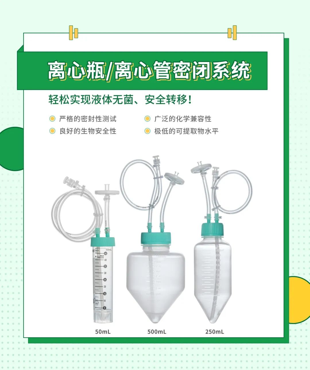 潔特生物離心瓶/離心管密閉系統(tǒng),優(yōu)選符合USP Class VI標(biāo)準(zhǔn)的原料在GMP標(biāo)準(zhǔn)潔凈車間制成,具有極低的可提取物水平以及良好的生物安全性,可用于全封閉式取樣及無(wú)菌移液。產(chǎn)品采用雙層包裝,每套系統(tǒng)均配備一個(gè)獨(dú)立包裝的密封蓋,可用其替換轉(zhuǎn)移蓋,便于后續(xù)的離心、檢測(cè)等操作。