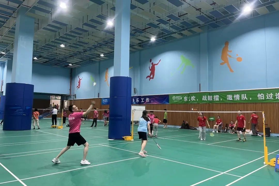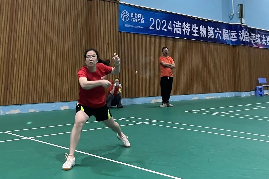 羽毛球場上,潔特生物的選手們你來我往,球拍翻飛。他們時而輕盈地將球挑起,時而迅猛地扣殺下去,每一次交鋒都讓人看得津津有味。觀眾們喝彩聲連連,為這場激烈的比賽加油助威。