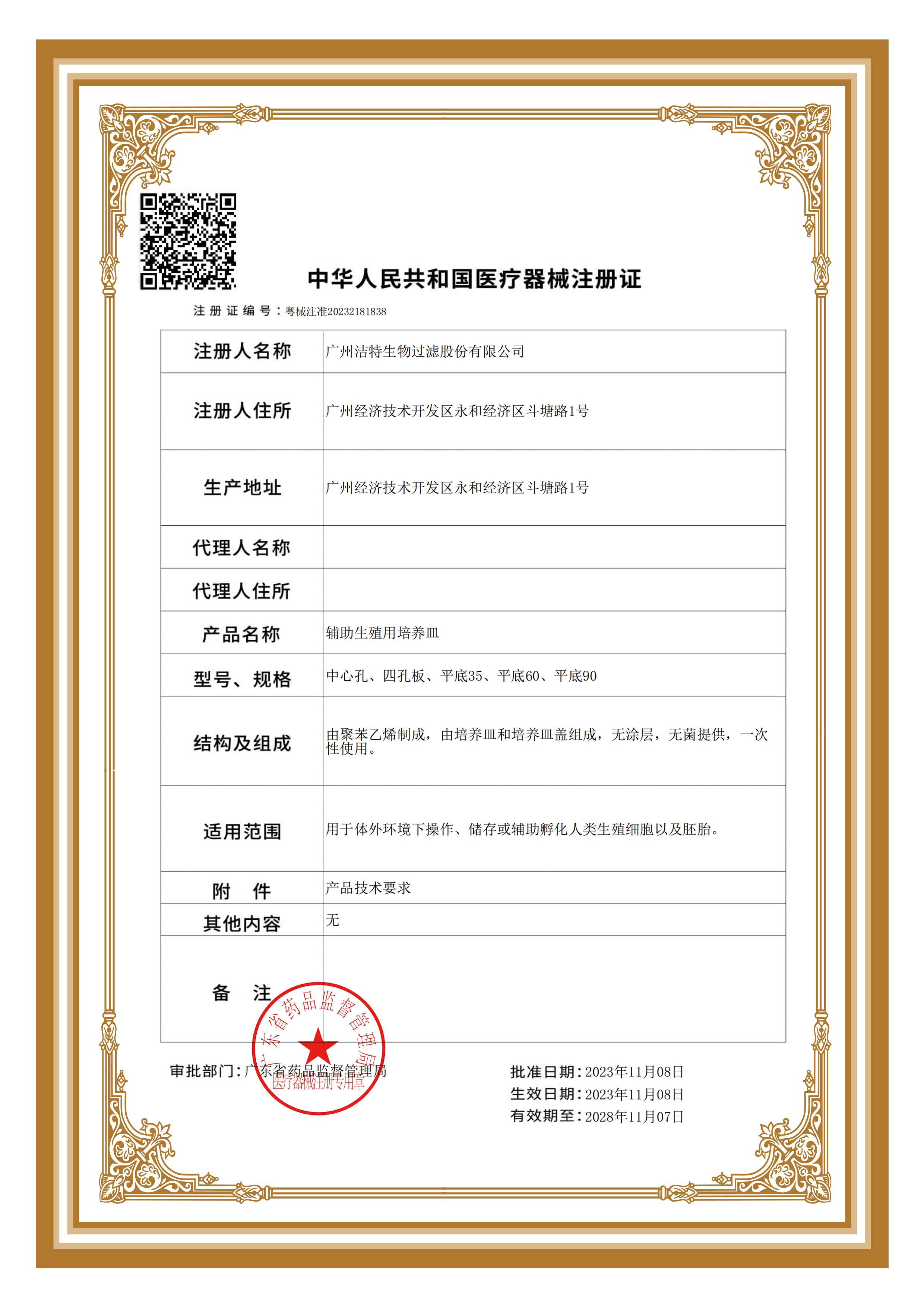 近年來,潔特生物潛心研發(fā),開拓了許多新的產(chǎn)品線,包括生物工藝系列耗材、輔助生殖系列耗材等,本次招商的是輔助生殖耗材,其中,輔助生殖專用培養(yǎng)皿已獲批醫(yī)療器械注冊證(注冊證編號:粵械注準20232181838)。