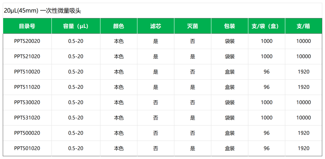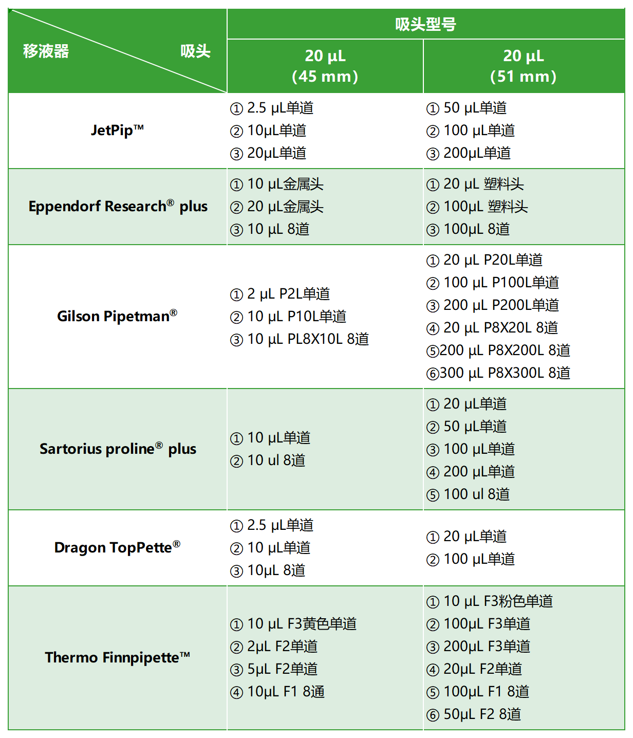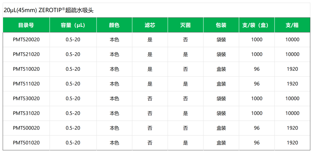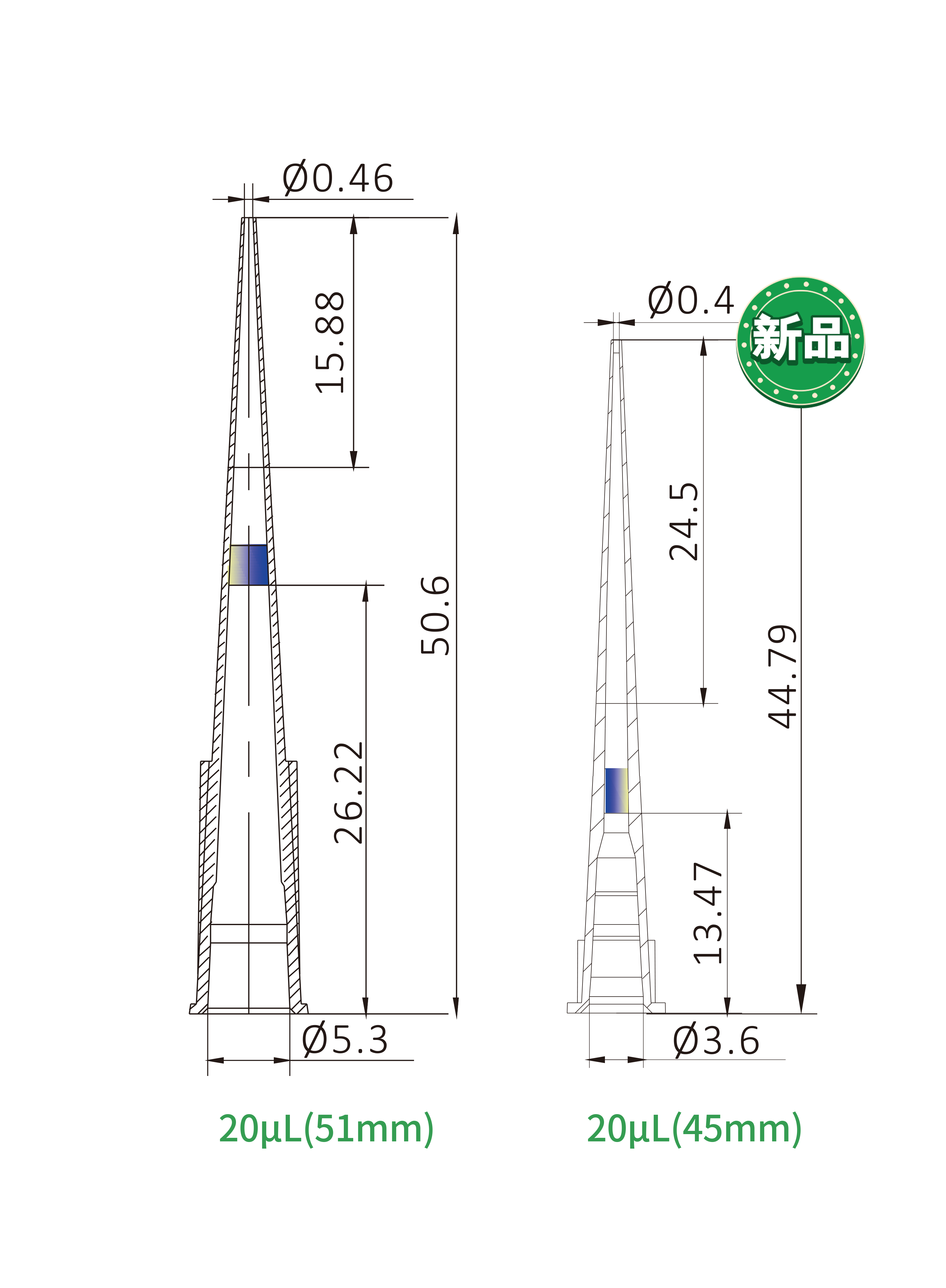 小潔:20μL(45 mm)吸頭和20μL(51 mm)吸頭一樣,有普通吸頭和ZEROTIP®超疏水吸頭兩類嗎?